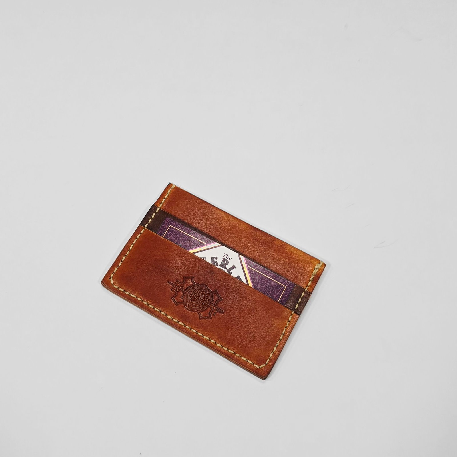 This Small card wallet features a hand-carved front panel with an original design of a classic style filigree. It fits all your essentials with two card pockets on the back and a larger pocket in the middle for any cash.